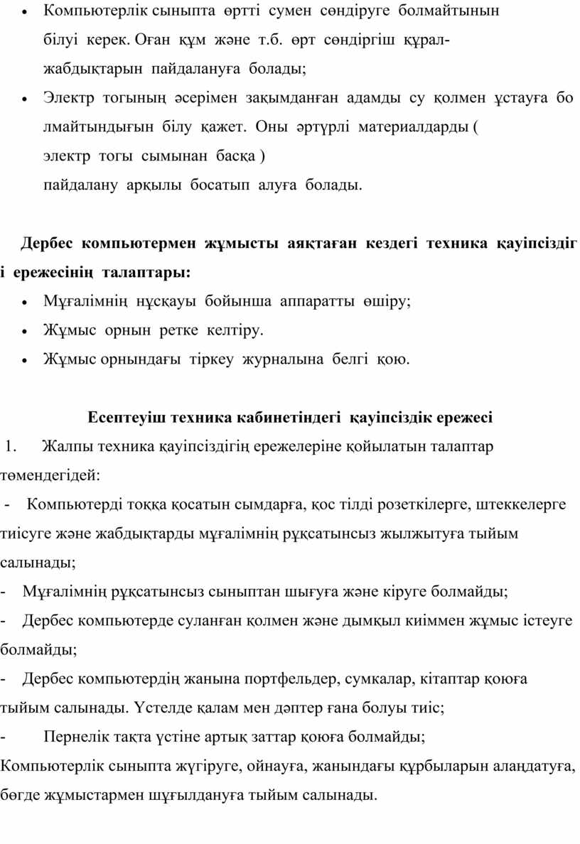 - Компьютерлік сыныпта жүгіруге, ойнауға, жанындағы құрбыларын аландатуға, бөгде жұмыстармен шұғылдануға тыйым салынады.