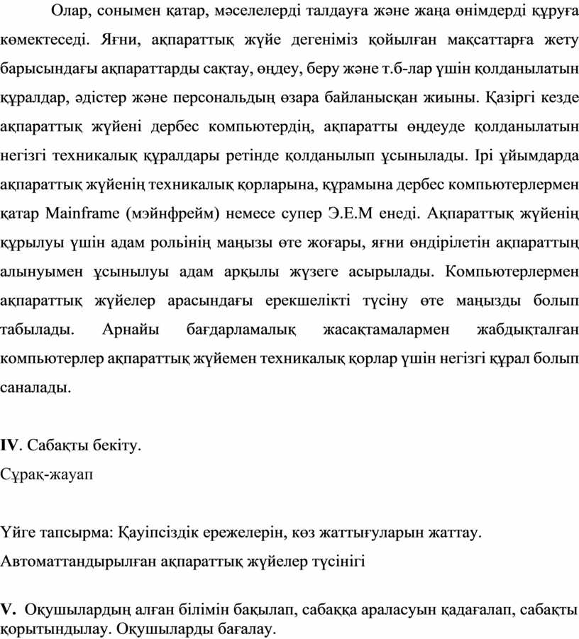 Үйге тапсырма: Қауіпсіздік ережелерін, көз жаттығуларын жаттау. Автоматтандырылған ақпараттық жүйелер түсінігі