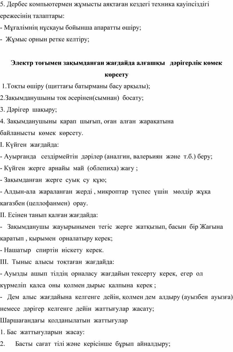 - Электр тоғымен зақымданған жағдайда алғашқы дәрігерлік көмек көрсету тәсілдерін, от сөндіру құралдарымен жұмыс істеуді білуі қажет.