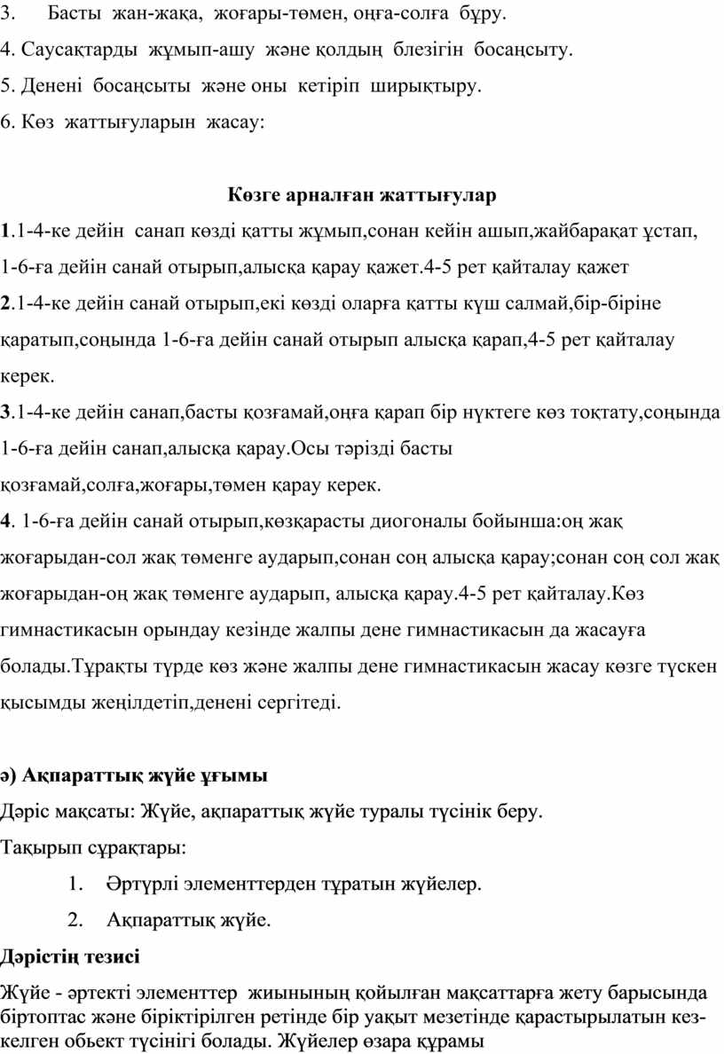 - Көзі шаршаған жағдайда орнынан тұрмай-ақ көз жаттығуларын орындауға ьолады;