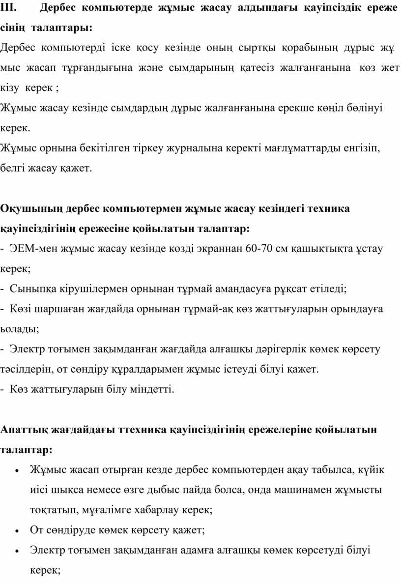III. Дербес компьютерде жұмыс жасау алдындағы қауіпсіздік ережесінің талаптары: