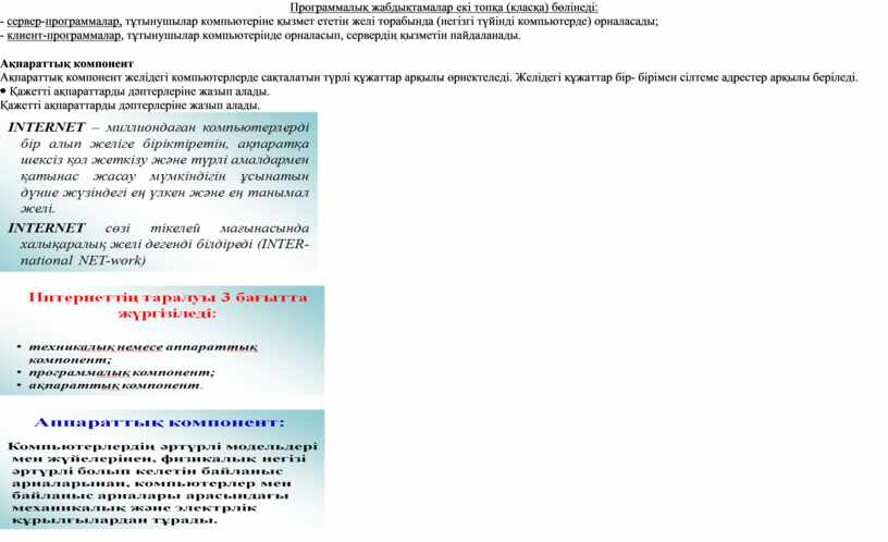 Интернеттің 3 таралу бағытын: -аппараттық компонент; -программалық компонент; -ақпараттық компоненттерін ұғынып, түсінеді.
