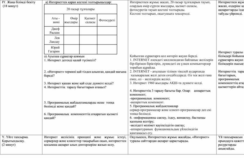 Интернетпен жұмыс жасап, 20 ғасыр тұлғаларын тауып, олардың өмір сүрген жылдары, қызмет саласы, фотосуретін тауып кестені толтырады. Кестені толтырып, оқытушыға тексертеді.