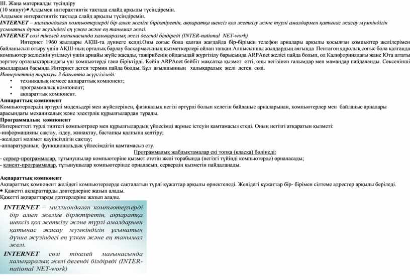 Алдымен интерактивтік тақтада слайд арқылы түсіндіремін. INTERNET – миллиондаған компьютерлерді бір алып желіге біріктіретін, ақпаратқа шексіз қол жеткізу және түрлі амалдармен қатынас жасау мүмкіндігін ұсынатын дүние жүзіндегі ең үлкен және ең танымал желі. INTERNET сөзі тікелей мағынасында халықаралық желі дегенді білдіреді (INTER-national NET-work) Интернет 1960 жылдары АҚШ-та дүниеге келдi.Оны соғыс бола қалған жағдайда бір-бірімен телефон арналары арқылы қосылған компьютер желілерімен байланысып отыру үшін АҚШ-ның орталық барлау басқармасының қызметкерлері ойлап тапқан.Алпысыншы жылдардың аяғында Пентагон ядролық соғыс бола қалғанда компьютер желісінің үзілмеуі үшін арнайы жүйе жасады, тaжiрибенiң ойдағыдай жүргiзiлу барысында ARPAnet желiсi пайда болып, ол Калифорниядағы жaне Юта штаты зерттеу орталықтарындағы үш компьютердi ғана бiрiктiрдi. Кейiн ARPAnet бейбiт мақсатқа қызмет еттi, оны негізінен ғалымдар мен мамандар пайдаланды. Сексенінші жылдардың басында Интернет деген термин пайда болды. Бұл ағылшынның халықаралық желі деген сөзі. Интернеттің таралуы 3 бағытта жүргізіледі: • техникалық немесе аппараттық компонент; • программалық компонент; • ақпараттық компонент. Аппараттық компонент Компьютерлердің әртүрлі модельдері мен жүйелерінен, физикалық негізі әртүрлі болып келетін байланыс арналарынан, компьютерлер мен байланыс арналары арасындағы механикалық және электрлік құрылғылардан тұрады. Программалық компонент Интернеттегі түрлі типтегі компьютрлер мен құрылғылардың үйлесімді жұмыс істеуін қамтамасыз етеді. Оның негізгі атқаратын қызметі: -информацияны сақтау, іздеу, жинақтау, бастапқы қалпына келтіру; -желідегі мәлімет қауіпсіздігін сақтау; -аппаратураның функциональдық үйлесімдігін қамтамасыз ету. Программалық жабдықтамалар екі топқа (класқа) бөлінеді: - сервер-программалар, тұтынушылар компьютеріне қызмет ететін желі торабында (негізгі түйінді компьютерде) орналасады; - клиент-программалар, тұтынушылар компьютерінде орналасып, сервердің қызметін пайдаланады.