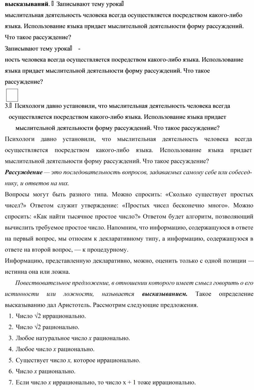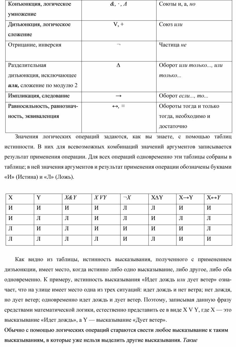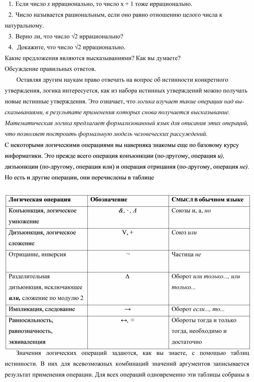 Психологи давно установили, что мыслительная деятельность человека всегда осуществляется посредством какого-либо языка. Использование языка придает мыслительной деятельности форму рассуждений. Что такое рассуждение? Рассуждение — это последовательность вопросов, задаваемых самому себе или собеседнику, и ответов на них. Вопросы могут быть разного типа. Можно спросить: «Сколько существует простых чисел?» Ответом служит утверждение: «Простых чисел бесконечно много». Можно спросить: «Как найти тысячное простое число?» Ответом будет алгоритм, позволяющий вычислить требуемое простое число. Напомним, что информацию, содержащуюся в ответе на первый вопрос, мы относим к декларативному типу, а информацию, содержащуюся в ответе на второй вопрос, — к процедурному. Информацию, представленную декларативно, можно, оценить только с одной позиции — истинна она или ложна. Повествовательное предложение, в отношении которого имеет смысл говорить о его истинности или ложности, называется высказыванием. Такое определение высказыванию дал Аристотель. Рассмотрим следующие предложения. 1. Число √2 иррационально. 2. Число √2 рационально. 3. Любое натуральное число х рационально. 4. Любое число х рационально. 5. Существует число х, которое иррационально. 6. Число х рационально. 7. Если число х иррационально, то число х + 1 тоже иррационально. 8. Число называется рациональным, если оно равно отношению целого числа к натуральному. 9. Верно ли, что число √2 иррационально? 10. Докажите, что число √2 иррационально. Какие предложения являются высказываниями? Как вы думаете? Обсуждение правильных ответов. Оставляя другим наукам право отвечать на вопрос об истинности конкретного утверждения, логика интересуется, как из набора истинных утверждений можно получать новые истинные утверждения. Это означает, что логика изучает такие операции над высказываниями, в результате применения которых снова получается высказывание. Математическая логика предлагает формализованный язык для описания этих операций, что позволяет построить формальную модель человеческих рассуждений. С некоторыми логическими операциями вы наверняка знакомы еще по базовому курсу информатики. Это прежде всего операция конъюнкции (по-другому, операция и), дизъюнкции (по-другому, операция или) и операция отрицания (по-другому, операция не). Но есть и другие операции, они перечислены в таблице