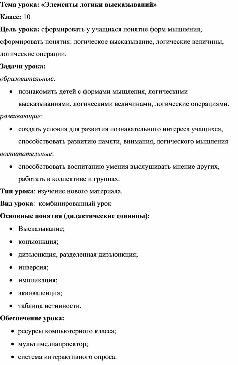 Цель урока: сформировать у учащихся понятие форм мышления, сформировать понятия: логическое высказывание, логические величины, логические операции.
