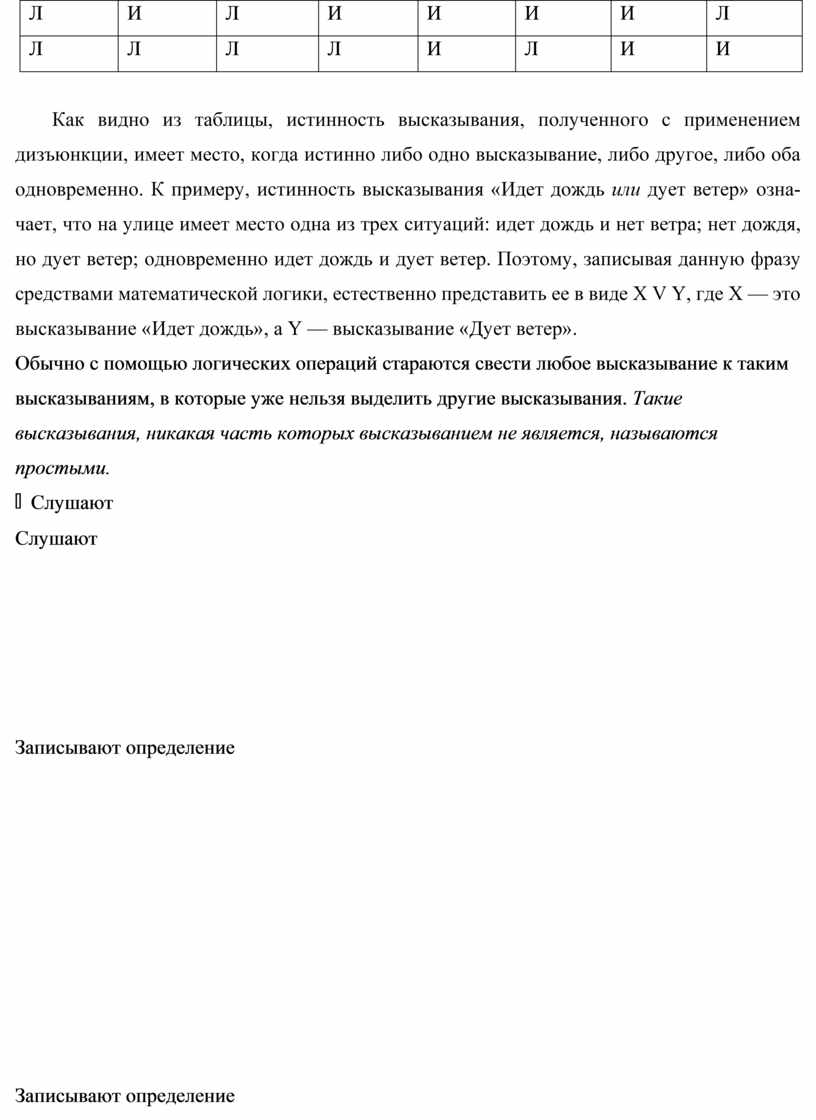 Как видно из таблицы, истинность высказывания, полученного с применением дизъюнкции, имеет место, когда истинно либо одно высказывание, либо другое, либо оба одновременно. К примеру, истинность высказывания «Идет дождь или дует ветер» означает, что на улице имеет место одна из трех ситуаций: идет дождь и нет ветра; нет дождя, но дует ветер; одновременно идет дождь и дует ветер. Поэтому, записывая данную фразу средствами математической логики, естественно представить ее в виде X V Y, где X — это высказывание «Идет дождь», a Y — высказывание «Дует ветер». Обычно с помощью логических операций стараются свести любое высказывание к таким высказываниям, в которые уже нельзя выделить другие высказывания. Такие высказывания, никакая часть которых высказыванием не является, называются простыми.