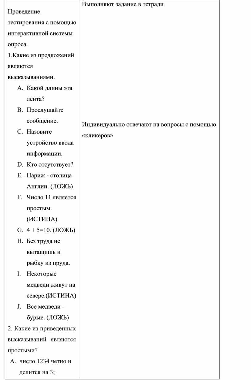 Проведение тестирования с помощью интерактивной системы опроса. 1.Какие из предложений являются высказываниями. A. Какой длины эта лента? B. Прослушайте сообщение. C. Назовите устройство ввода информации. D. Кто отсутствует? E. Париж - столица Англии. (ЛОЖЬ) F. Число 11 является простым. (ИСТИНА) G. 4 + 5=10. (ЛОЖЬ) H. Без труда не вытащишь и рыбку из пруда. I. Некоторые медведи живут на севере.(ИСТИНА) J. Все медведи - бурые. (ЛОЖЬ) 2. Какие из приведенных высказываний являются простыми? A. число 1234 четно и делится на 3; B. число 1234 нечетно и делится на 3; C. число 1234 четно или не делится на 3; D. число 1234 нечетно или не делится на 3. 3. Найдите значения логических выражений: F= (lvl)v(lv0) (ответ: 1) 4. Найдите значения логических выражений: F= ┐1&(1 v1) v(┐0&1) (ответ: 1) 5. Какое логическое выражение соответствует высказыванию: "Точка X принадлежит интервалу (А; В)". A. (Х<А) или (Х>В) B. (Х>А)и(Х<В) C. Не(Х<А) или(Х<В) D. (Х>А)или(Х>В)