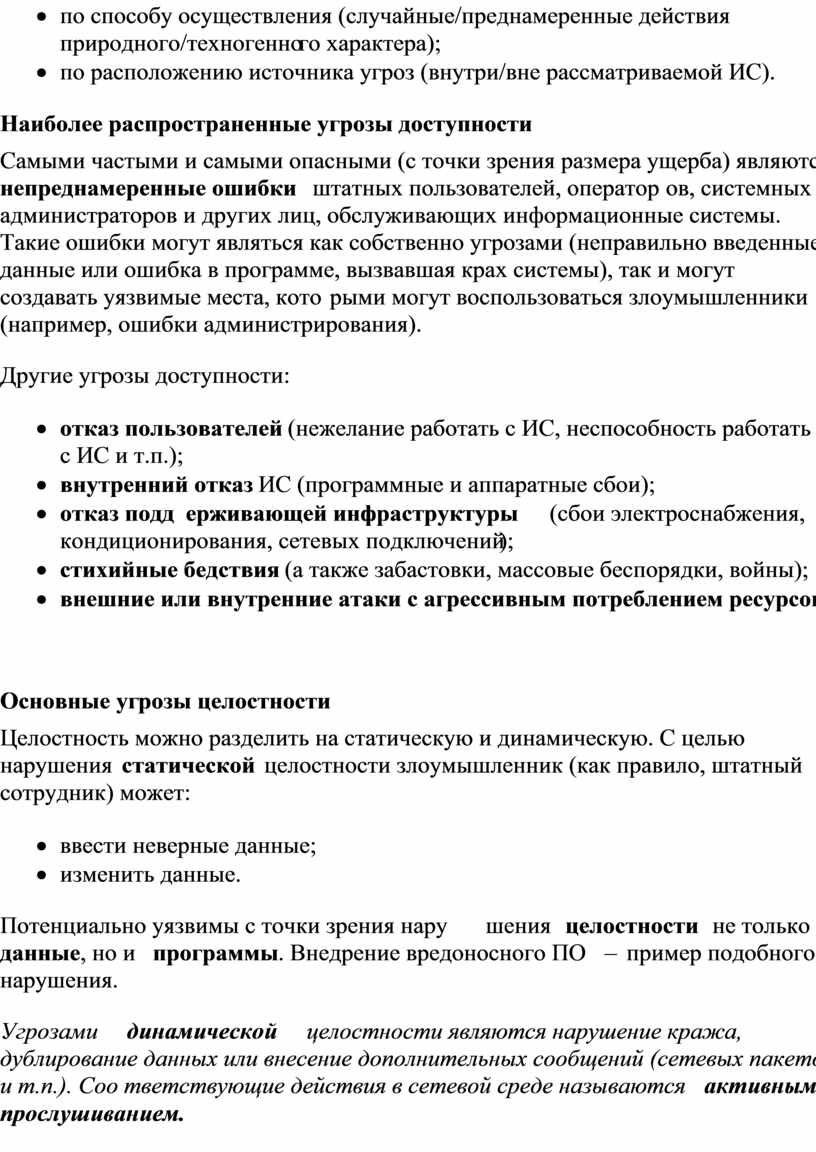 Целостность можно разделить на статическую и динамическую. С целью нарушения статической целостности злоумышленник (как правило, штатный сотрудник) может:
