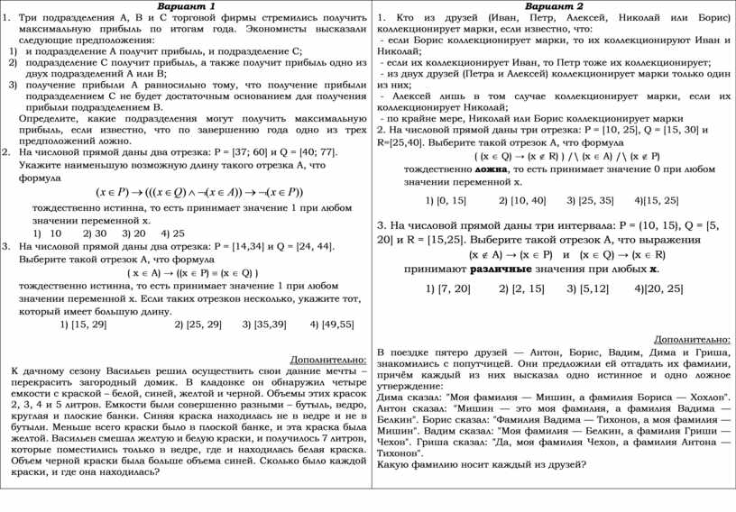Вариант 1 1. Три подразделения А, В и С торговой фирмы стремились получить максимальную прибыль по итогам года. Экономисты высказали следующие предположения: 1) и подразделение А получит прибыль, и подразделение С; 2) подразделение С получит прибыль, а также получит прибыль одно из двух подразделений А или В; 3) получение прибыли А равносильно тому, что получение прибыли подразделением С не будет достаточным основанием для получения прибыли подразделением В. Определите, какие подразделения могут получить максимальную прибыль, если известно, что по завершению года одно из трех предположений ложно. 2. На числовой прямой даны два отрезка: P = [37; 60] и Q = [40; 77]. Укажите наименьшую возможную длину такого отрезка A, что формула