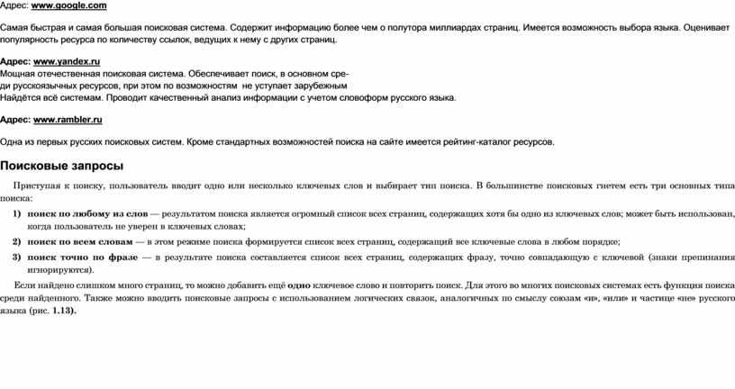 Поисковые системы Все системы поиска информации во Всемирной паутине располагаются на специально выделенных компьютерах с мощными каналами связи. Ежеминутно они обслуживают огромное количество клиентов. Действие поисковых систем основано на постоянном, последовательном изучении всех страниц всех сайтов Всемирной паутины. Для каждого документа составляется его поисковый образ — набор ключевых слов, отражающих содержание этого документа. В связи с постоянным обновлением информации поисковые системы периодически возвращаются к ранее изученным страницам, чтобы обнаружить и зарегистрировать изменения. Информация о ключевых словах исследованных таким образом страниц сохраняется в поисковой системе. При поступлении запроса от пользователя поисковая система на основании имеющейся в ней информации формирует список страниц, соответствующих критериям поиска. Найденные документы, как правило, упорядочиваются в зависимости от местоположения ключевых слов (в заголовке, в начале текста), частоты их появления в тексте и других характеристик. Существует множество поисковых систем. Несмотря на общий принцип работы, поисковые системы различаются по языкам запроса, зонам поиска, глубине поиска внутри документа, методам упорядочивания информации и другим характеристикам. Самой популярной в мире поисковой системой является Google. Крупнейшие отечественные поисковые системы — Яндекс, Rambler. Адрес: www.google.com Самая быстрая и самая большая поисковая система. Содержит информацию более чем о полутора миллиардах страниц. Имеется возможность выбора языка. Оценивает популярность ресурса по количеству ссылок, ведущих к нему с других страниц. Адрес: www.yandex.ru Адрес: www.rambler.ru Одна из первых русских поисковых систем. Кроме стандартных возможностей поиска на сайте имеется рейтинг-каталог ресурсов. Поисковые запросы Приступая к поиску, пользователь вводит одно или несколько ключевых слов и выбирает тип поиска. В большинстве поисковых гнетем есть три основных типа поиска: 1) поиск по любому из слов — результатом поиска является огромный список всех страниц, содержащих хотя бы одно из ключевых слов; может быть использован, когда пользователь не уверен в ключевых словах; 2) поиск по всем словам — в этом режиме поиска формируется список всех страниц, содержащий все ключевые слова в любом порядке; 3) поиск точно по фразе — в результате поиска составляется список всех страниц, содержащих фразу, точно совпадающую с ключевой (знаки препинания игнорируются). Если найдено слишком много страниц, то можно добавить ещё одно ключевое слово и повторить поиск. Для этого во многих поисковых системах есть функция поиска среди найденного. Также можно вводить поисковые запросы с использованием логических связок, аналогичных по смыслу союзам «и», «или» и частице «не» русского языка (рис. 1.13).