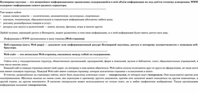 Информация в WWW организована в виде страниц (Web-страниц). ------------------------------------------------------------------------------------------------------------------------------------ Веб-страница (англ. Web page) — документ или информационный ресурс Всемирной паутины, доступ к которому осуществляется с помощью веб-браузера. ------------------------------------------------------------------------------------------------------------------------------- Web-сайт — это несколько Web-страниц, связанных между собой по содержанию. -------------------------------------------------------------------------------------------------------------------------------- Сайты есть у государственных структур, общественных организаций, предприятий, фирм и компаний, музеев и библиотек, газет, образовательных учреждений, в том числе многих школ. Каждый сайт и каждая страница имеют свой адрес, по которому к ним можно обратиться. Web-сайты сильно отличаются друг от друга по оформлению, но чаще всего они имеют похожую структуру. Каждый Web-сайт имеет главную страницу, которая аналогична странице с оглавлением в книге. В текстах, размещённых на страницах сайтов, могут быть выделены ключевые слова — гиперссылки, от которых идут гиперсвязи. Они выделяются цветом или подчёркиванием. Щёлкнув мышью на таком слове, мы переходим к просмотру другого документа, причём этот документ может находиться на другом компьютере, в другой стране, на другом континенте. В качестве гиперссылок может использоваться не только текст, но и любое графическое изображение. Такую организацию информации называют гипертекстом.