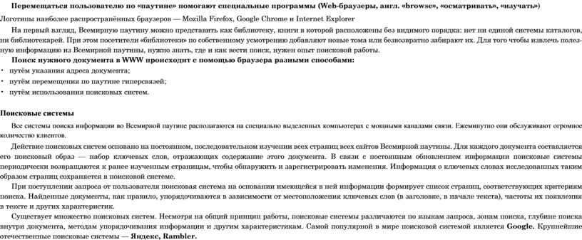 Перемещаться пользователю по «паутине» помогают специальные программы (Web-браузеры, англ. «browse», «осматривать», «изучать») Логотипы наиболее распространённых браузеров — Mozilla Firefox, Google Chrome и Internet Explorer На первый взгляд, Всемирную паутину можно представить как библиотеку, книги в которой расположены без видимого порядка: нет ни единой системы каталогов, ни библиотекарей. При этом посетители «библиотеки» по собственному усмотрению добавляют новые тома или безвозвратно забирают их. Для того чтобы извлечь полезную информацию из Всемирной паутины, нужно знать, где и как вести поиск, нужен опыт поисковой работы. Поиск нужного документа в WWW происходит с помощью браузера разными способами: • путём указания адреса документа; • путём перемещения по паутине гиперсвязей; • путём использования поисковых систем.