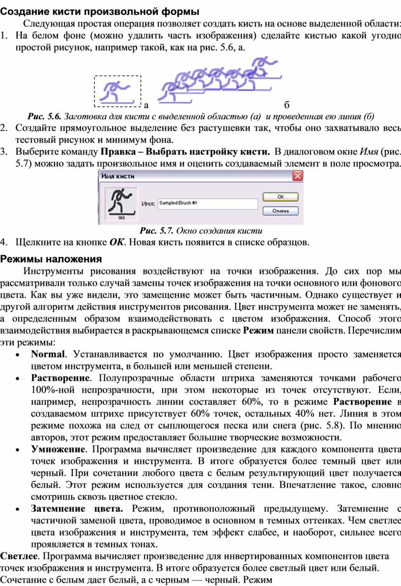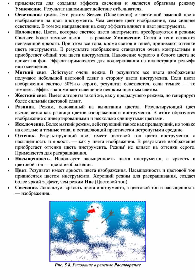 Инструменты рисования воздействуют на точки изображения. До сих пор мы рассматривали только случай замены точек изображения на точки основного или фонового цвета. Как вы уже видели, это замещение может быть частичным. Однако существует и другой алгоритм действия инструментов рисования. Цвет инструмента может не заменять, а определенным образом взаимодействовать с цветом изображения. Способ этого взаимодействия выбирается в раскрывающемся списке Режим панели свойств. Перечислим эти режимы: