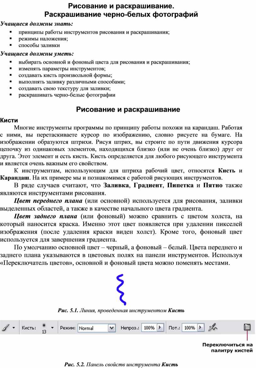 Кончик инструментов рисования имеет определенный размер и форму (размер кисти и форма кисти). Кроме того, каждый инструмент имеет параметры, которые определяют характер их работы.