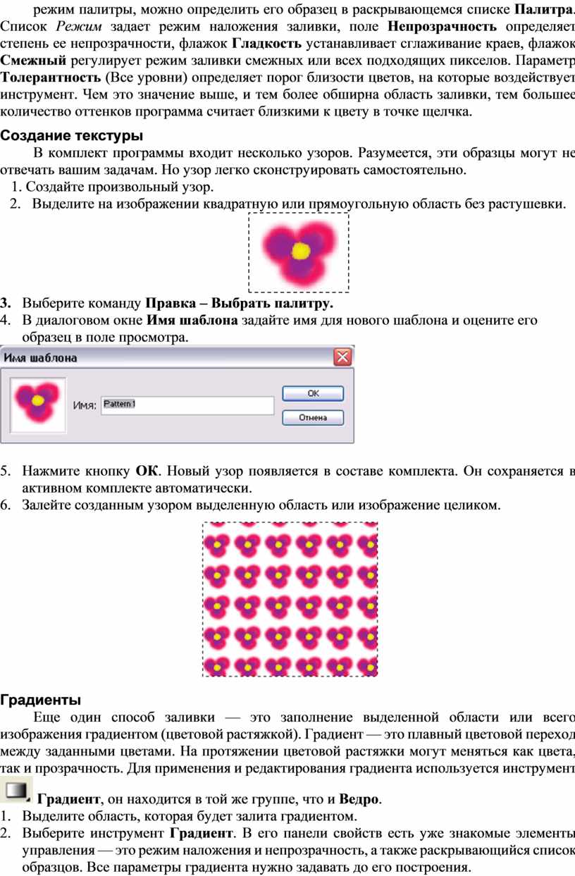 Палитра (шаблон) - это небольшой фрагмент любого изображения, который программа при заливке многократно повторяет, заполняя выделенную область.