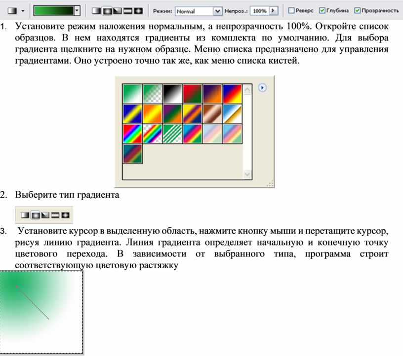 3. Установите режим наложения нормальным, а непрозрачность 100%. Откройте список образцов. В нем находятся градиенты из комплекта по умолчанию. Для выбора градиента щелкните на нужном образце. Меню списка предназначено для управления градиентами. Оно устроено точно так же, как меню списка кистей.