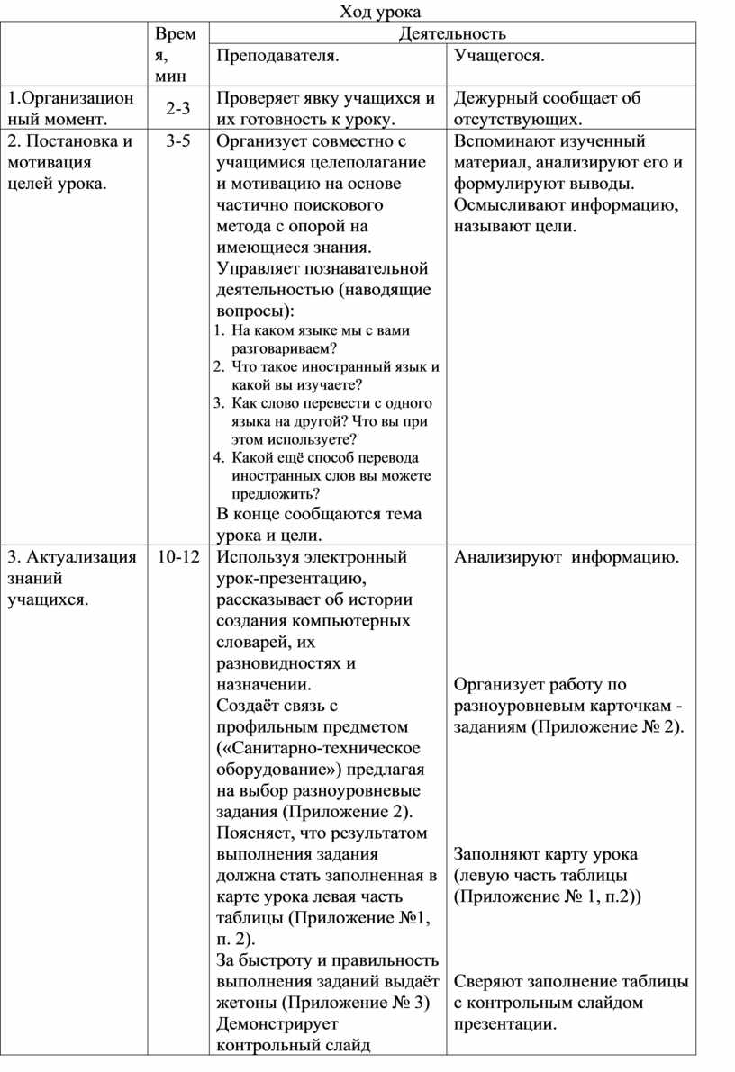 Используя электронный урок-презентацию, рассказывает об истории создания компьютерных словарей, их разновидностях и назначении. Создаёт связь с профильным предметом («Санитарно-техническое оборудование») предлагая на выбор разноуровневые задания (Приложение 2). Поясняет, что результатом выполнения задания должна стать заполненная в карте урока левая часть таблицы (Приложение №1, п. 2). За быстроту и правильность выполнения заданий выдаёт жетоны (Приложение № 3) Демонстрирует контрольный слайд |