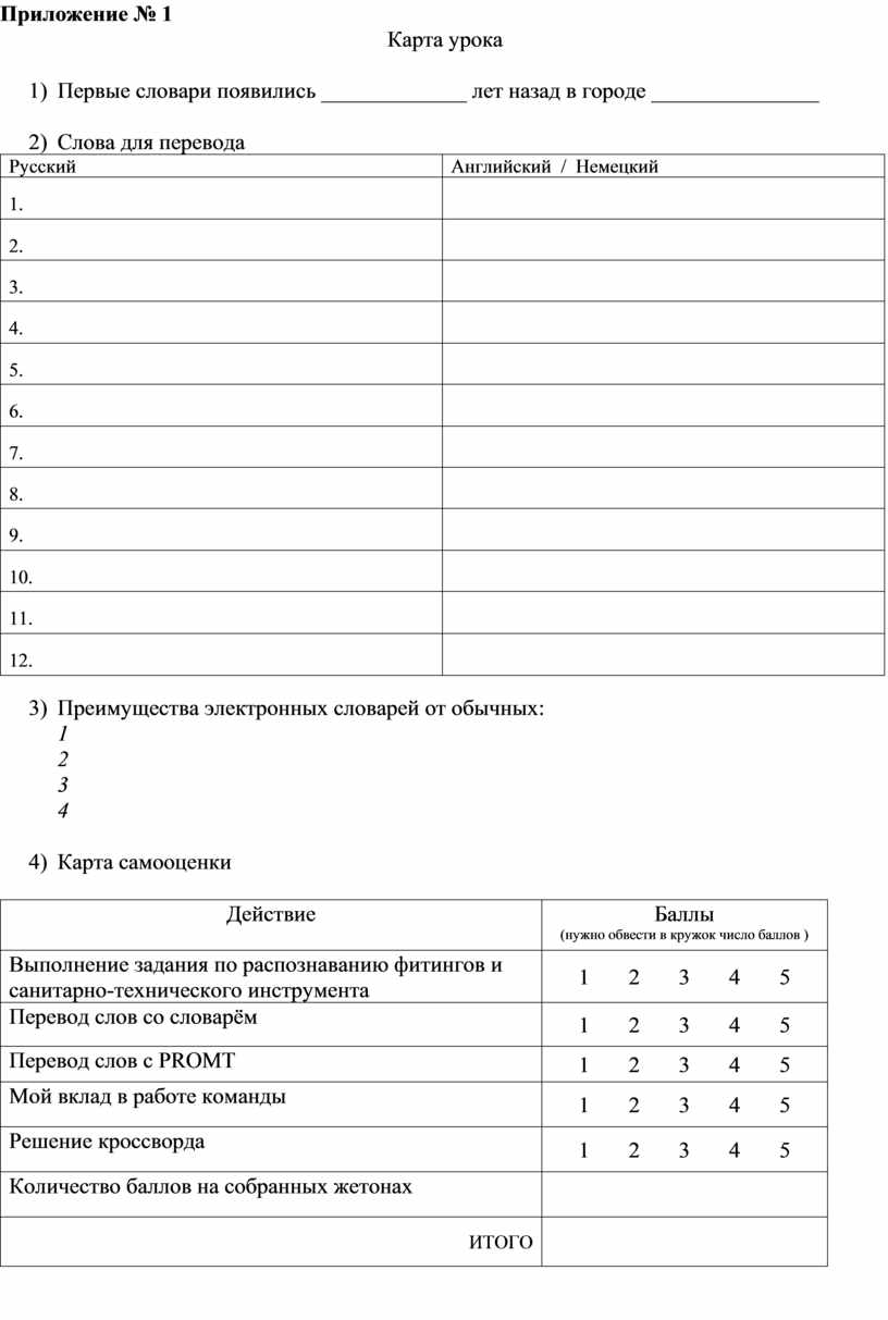 Заполняют карту урока (левую часть таблицы (Приложение № 1, п.2))