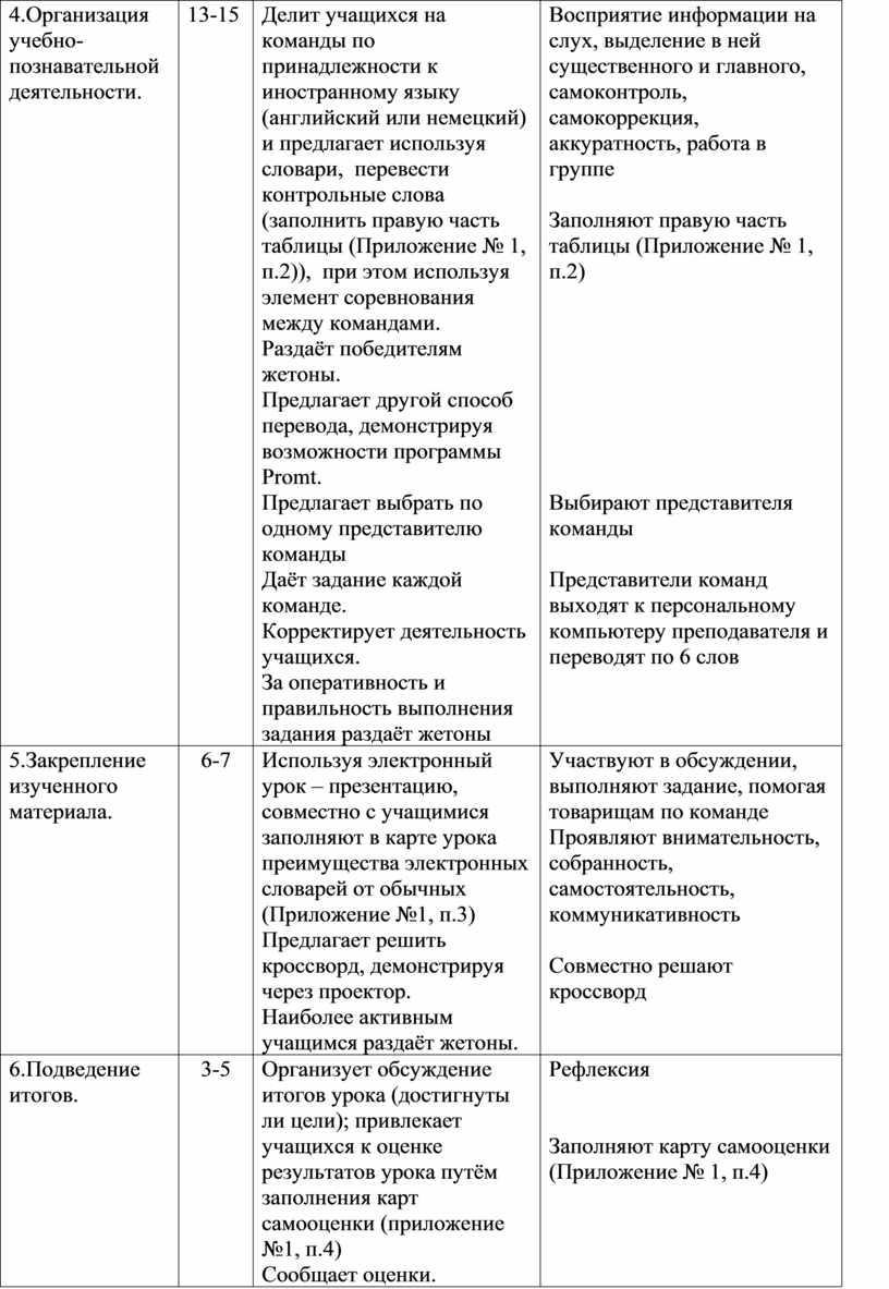 Делит учащихся на команды по принадлежности к иностранному языку (английский или немецкий) и предлагает используя словари, перевести контрольные слова (заполнить правую часть таблицы (Приложение № 1, п.2)), при этом используя элемент соревнования между командами. Раздаёт победителям жетоны. Предлагает другой способ перевода, демонстрируя возможности программы Promt. Предлагает выбрать по одному представителю команды Даёт задание каждой команде. Корректирует деятельность учащихся. За оперативность и правильность выполнения задания раздаёт жетоны |