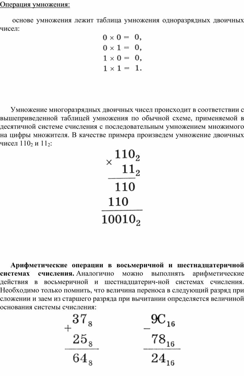 Арифметические операции в восьмеричной и шестнадцатеричной системах счисления. Аналогично можно выполнять арифметические действия в восьмеричной и шестнадцатерич-ной системах счисления. Необходимо только помнить, что величина переноса в следующий разряд при сложении и заем из старшего разряда при вычитании определяется величиной основания системы счисления: