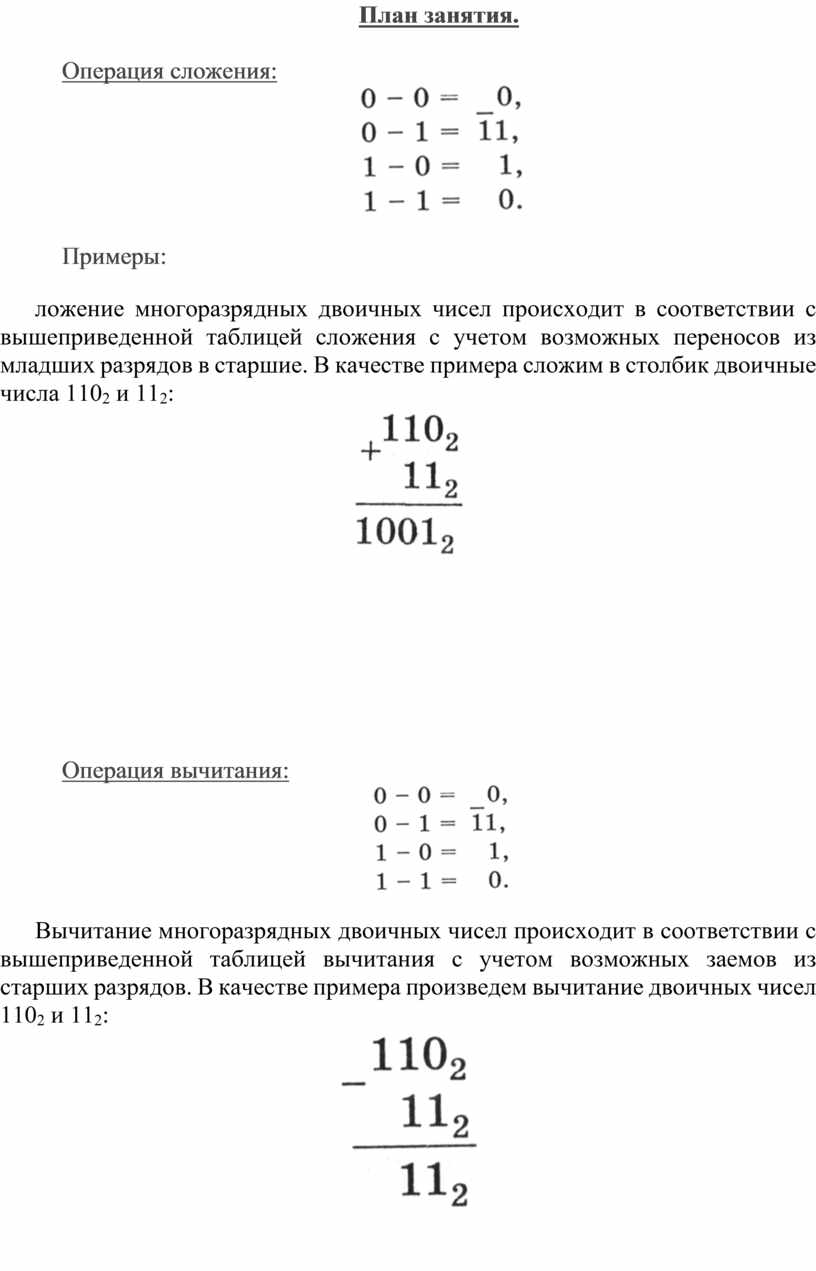 Вычитание многоразрядных двоичных чисел происходит в соответствии с вышеприведенной таблицей вычитания с учетом возможных заемов из старших разрядов. В качестве примера произведем вычитание двоичных чисел 1102 и 112: