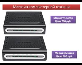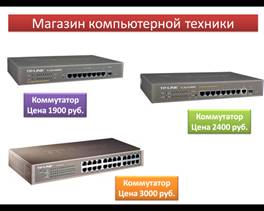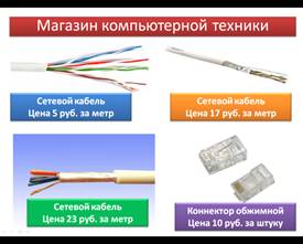 2. Произвести расчёт стоимости подключения к локальной сети. Расчёт производить согласно ценам на соответствующие товары в магазине (витрина магазина представлена на слайде) и с учётом схемы расположения компьютеров в офисе.