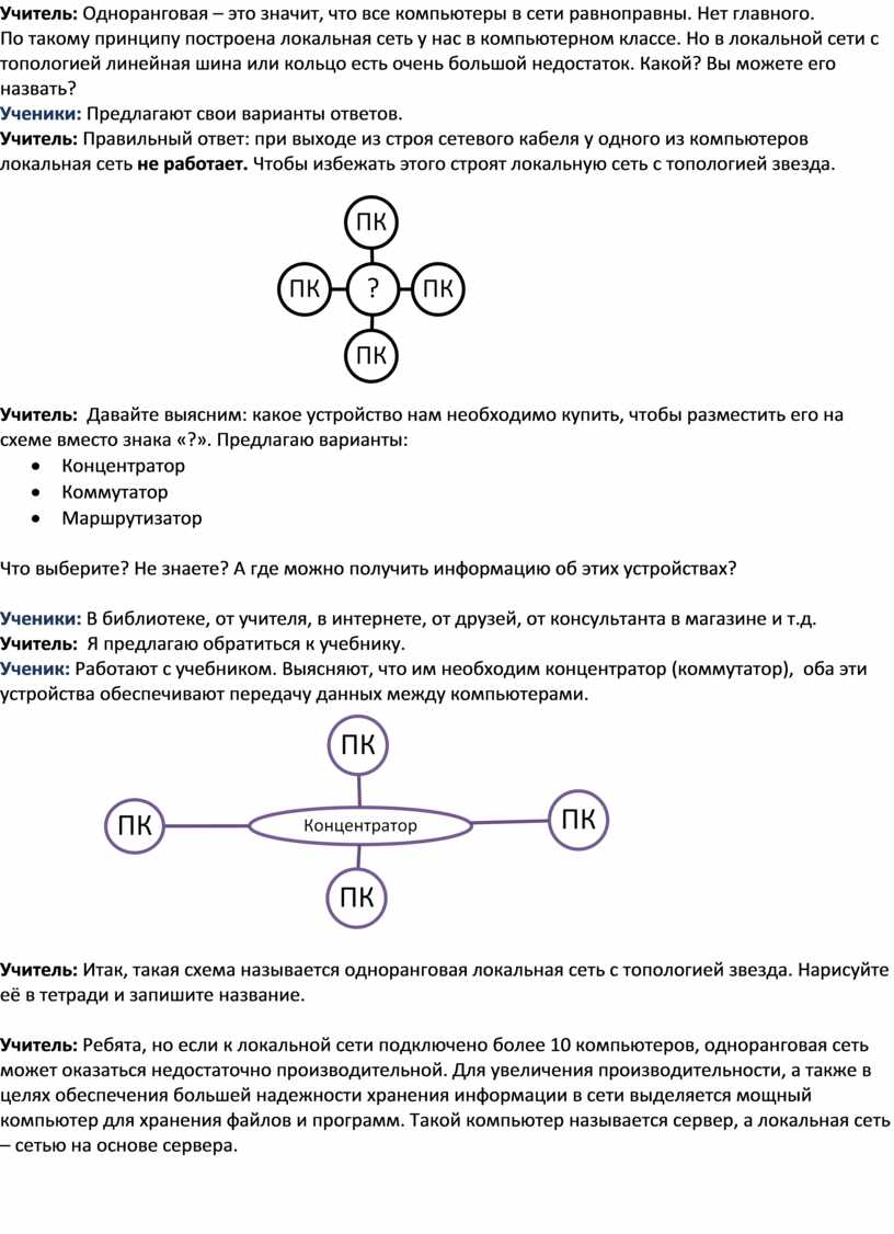 Ученик: Работают с учебником. Выясняют, что им необходим концентратор (коммутатор), оба эти устройства обеспечивают передачу данных между компьютерами.