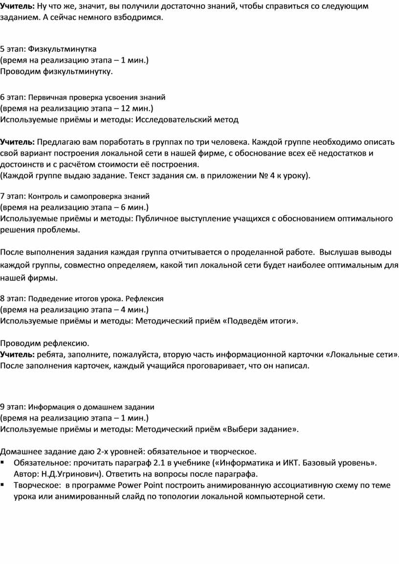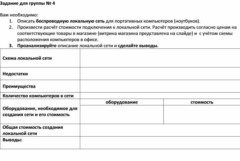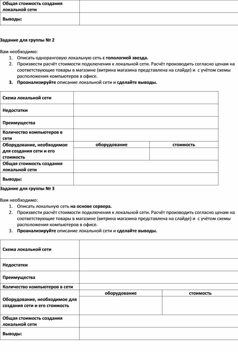 После выполнения задания каждая группа отчитывается о проделанной работе. Выслушав выводы каждой группы, совместно определяем, какой тип локальной сети будет наиболее оптимальным для нашей фирмы.