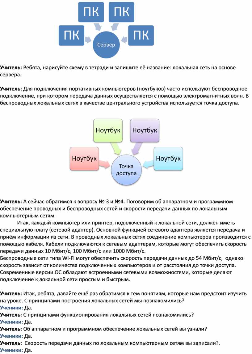 Учитель: А сейчас обратимся к вопросу № 3 и №4. Поговорим об аппаратном и программном обеспечение проводных и беспроводных сетей и скорости передачи данных по локальным компьютерным сетям.
