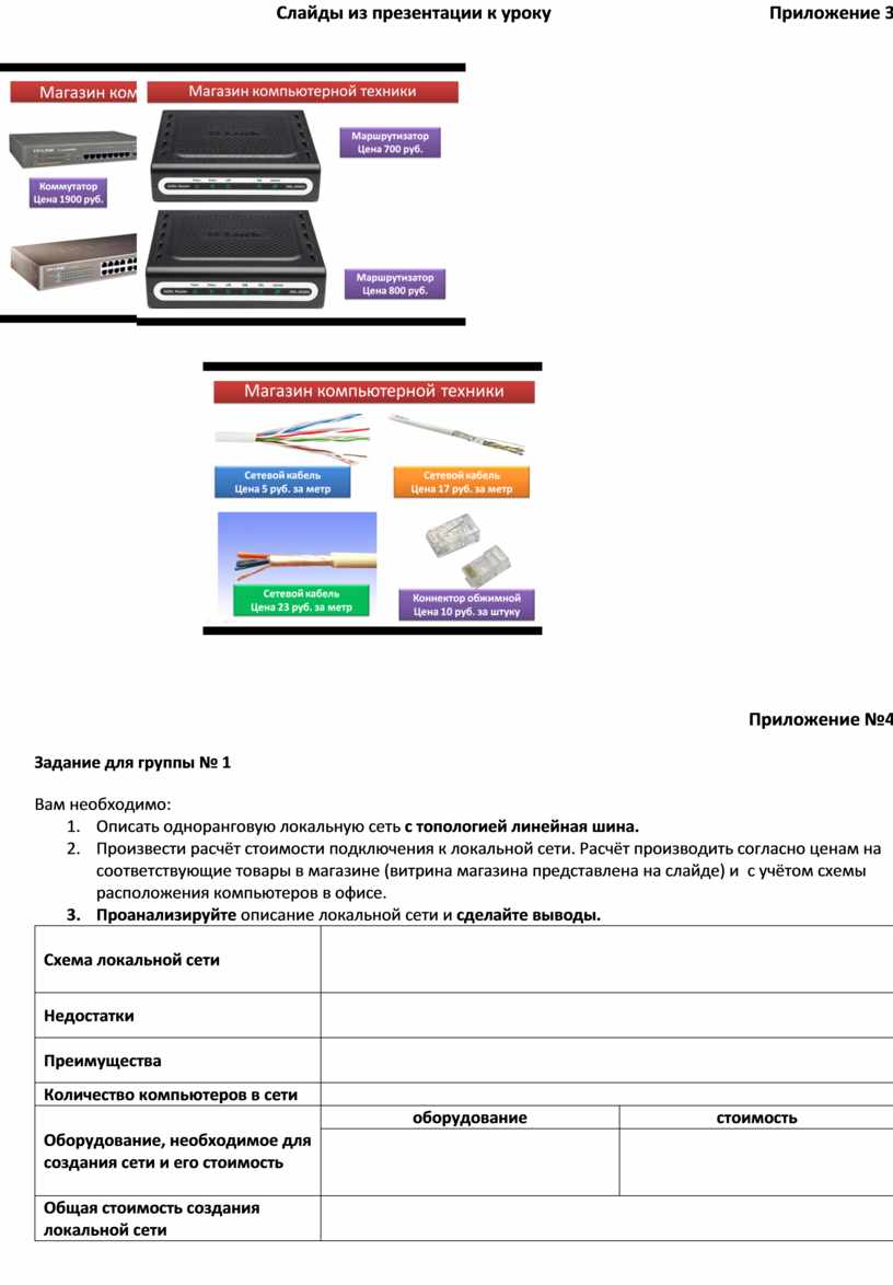 Учитель: Предлагаю вам поработать в группах по три человека. Каждой группе необходимо описать свой вариант построения локальной сети в нашей фирме, с обоснование всех её недостатков и достоинств и с расчётом стоимости её построения.