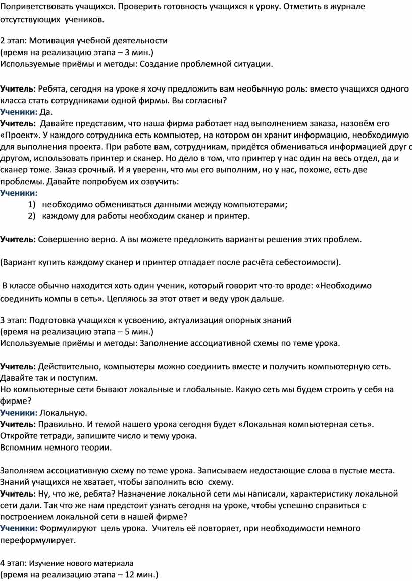 Создаётся проблемная ситуация: предлагаю учащимся представить, что они являются сотрудниками фирмы. У каждого из них есть свой рабочий компьютер. Проблема в том, что каждый сотрудник выполняет только часть заказа фирмы и есть необходимость обмениваться данными с другими сотрудниками, пользоваться принтером и сканером, а периферийные устройства (принтер, сканер) один на весь отдел.