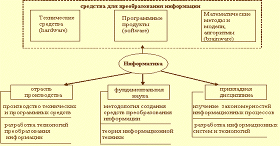 Информатика - область человеческой деятельности, связанная с процессами преобразования информации с помощью компьютеров и других средств вычислительной техники. С информатикой часто связывают одно из следующих понятий: это либо отрасль производства, либо фундаментальная наука, либо прикладная дисциплина, либо совокупность определенных средств, используемых для преобразования информации. В соответствии с этим структура информатики различна в зависимости от вкладываемого содержания. Она приведена на рис. 1.1. В состав технических средств входят компьютеры и связанные с ними периферийные устройства (мониторы, клавиатуры, принтеры и плоттеры, модемы и т.д.), линии связи, средства оргтехники и т.п., т.е. те материальные ресурсы, которые обеспечивают преобразование информации, причем главенствующую роль в этом списке играет компьютер. По своей специфике компьютер нацелен на решение очень широкого круга задач по преобразованию информации, при этом выбор конкретной задачи при использовании компьютера определяется программным средством, под управлением которого функционирует компьютер.