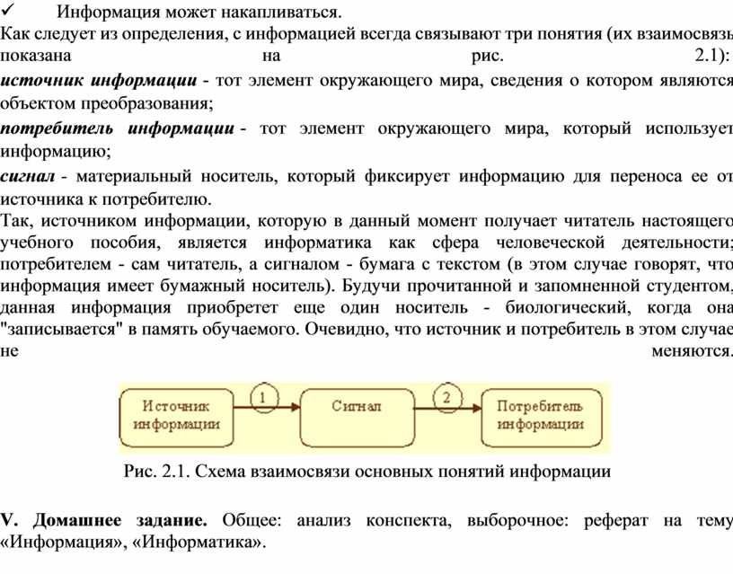 V. Домашнее задание. Общее: анализ конспекта, выборочное: реферат на тему «Информация», «Информатика».