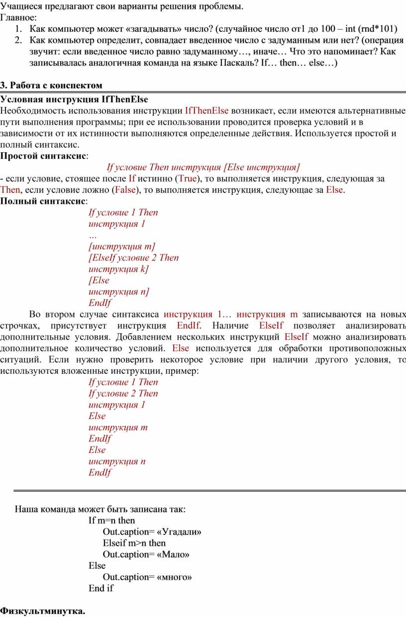 Необходимость использования инструкции IfThenElse возникает, если имеются альтернативные пути выполнения программы; при ее использовании проводится проверка условий и в зависимости от их истинности выполняются определенные действия. Используется простой и полный синтаксис.
