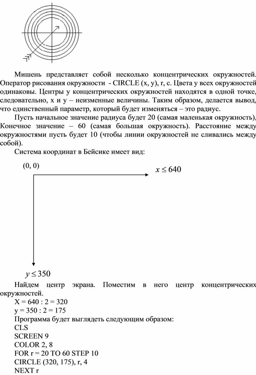 Мишень представляет собой несколько концентрических окружностей. Оператор рисования окружности - CIRCLE (x, y), r, c. Цвета у всех окружностей одинаковы. Центры у концентрических окружностей находятся в одной точке, следовательно, x и y – неизменные величины. Таким образом, делается вывод, что единственный параметр, который будет изменяться – это радиус.