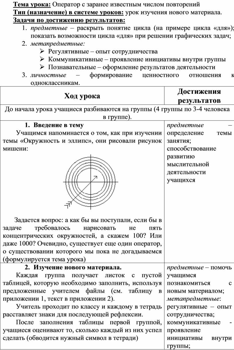 Задается вопрос: а как бы вы поступали, если бы в задаче требовалось нарисовать не пять концентрических окружностей, а скажем 100? Или даже 1000? Очевидно, существует еще один оператор, о существовании которого мы пока не догадываемся (формулируется тема урока) |