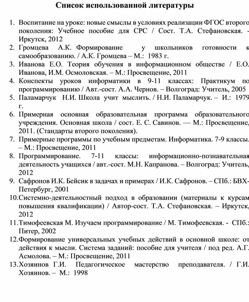 2. Громцева А.К. Формирование у школьников готовности к самообразованию. / А.К. Громцева – М.: 1983 г.