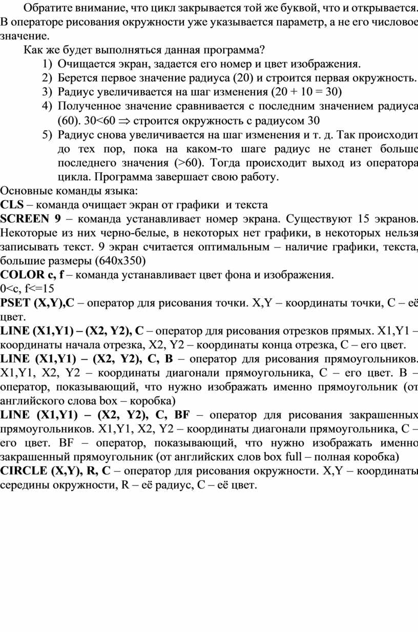 Обратите внимание, что цикл закрывается той же буквой, что и открывается. В операторе рисования окружности уже указывается параметр, а не его числовое значение.