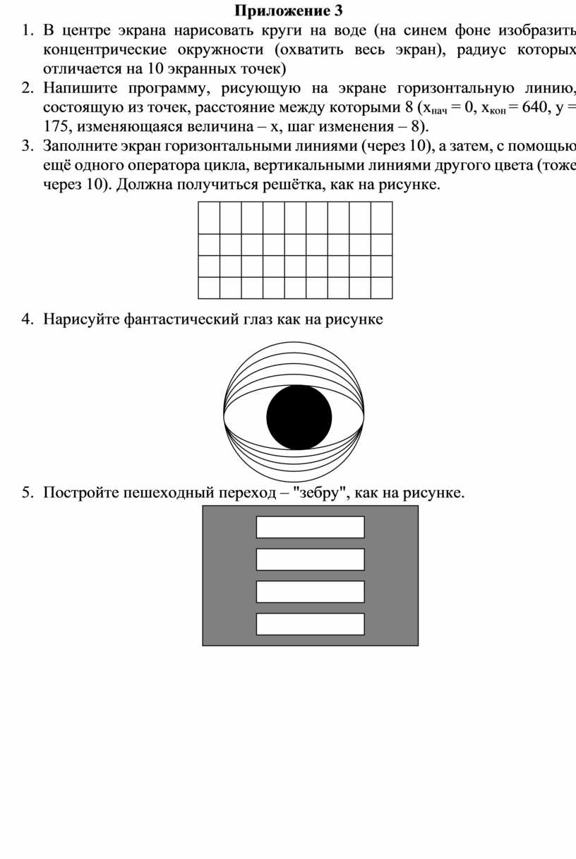 1. В центре экрана нарисовать круги на воде (на синем фоне изобразить концентрические окружности (охватить весь экран), радиус которых отличается на 10 экранных точек)