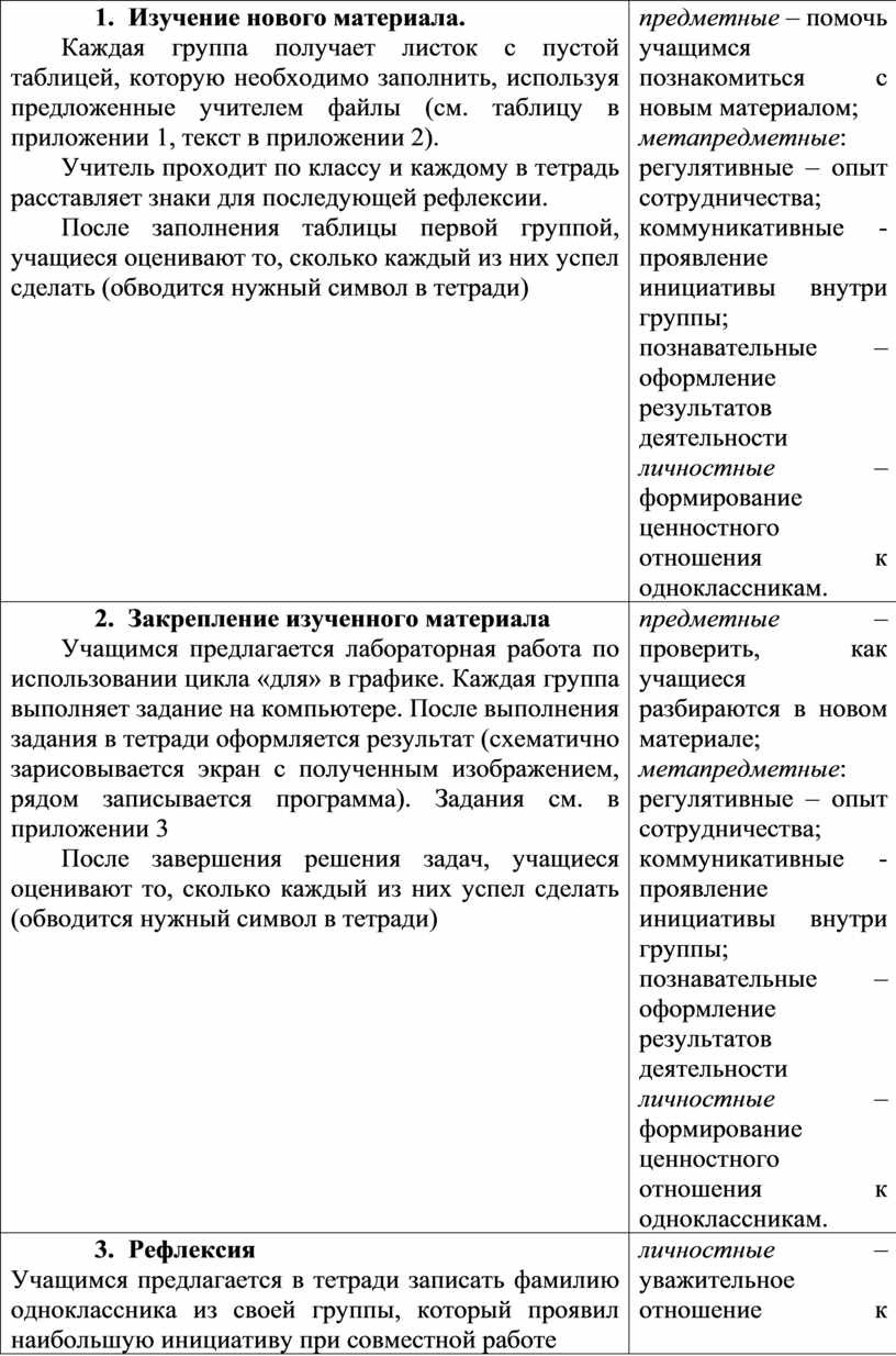 2. Изучение нового материала. Каждая группа получает листок с пустой таблицей, которую необходимо заполнить, используя предложенные учителем файлы (см. таблицу в приложении 1, текст в приложении 2). Учитель проходит по классу и каждому в тетрадь расставляет знаки для последующей рефлексии. После заполнения таблицы первой группой, учащиеся оценивают то, сколько каждый из них успел сделать (обводится нужный символ в тетради)
