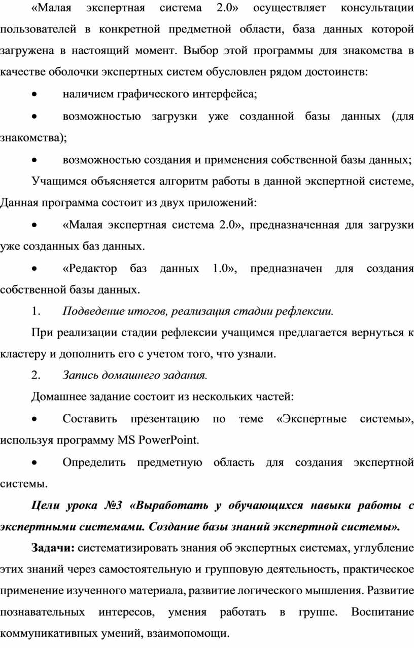 Для удовлетворения познавательного интереса к изучаемой теме, а также формирования навыков работы в экспертных системах, учащимся предлагается изучить программу «Малая экспертная система 2.0. Программа «Малая экспертная система 2.0» осуществляет консультации пользователей в конкретной предметной области, база данных которой загружена в настоящий момент. Выбор этой программы для знакомства в качестве оболочки экспертных систем обусловлен рядом достоинств: