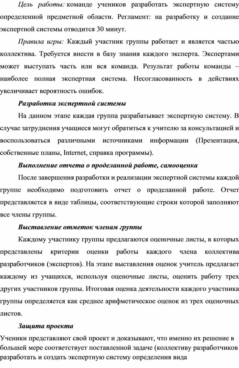 Цель работы: команде учеников разработать экспертную систему определенной предметной области. Регламент: на разработку и создание экспертной системы отводится 30 минут.