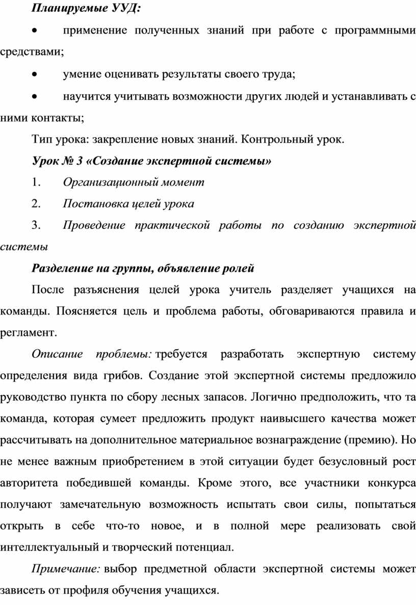 Примечание: выбор предметной области экспертной системы может зависеть от профиля обучения учащихся.