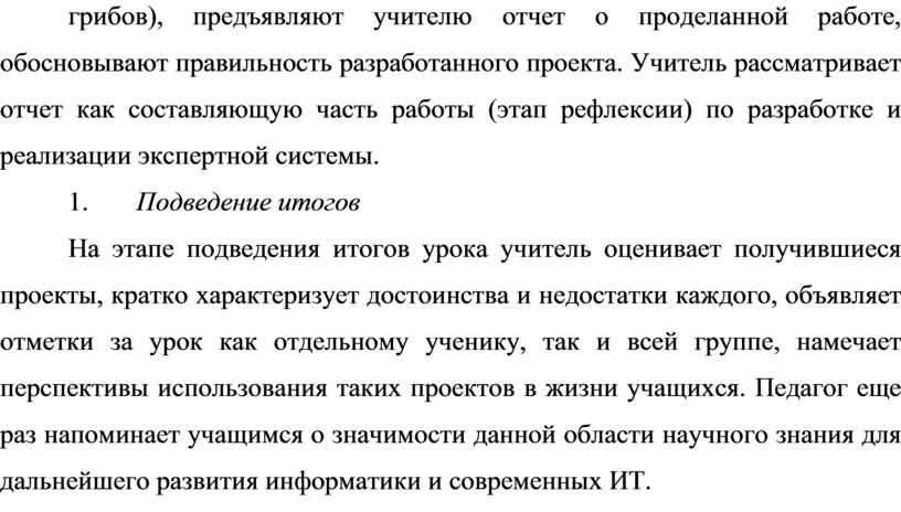 Ученики представляют свой проект и доказывают, что именно их решение в большей мере соответствует поставленной задаче (коллективу разработчиков разработать и создать экспертную систему определения вида грибов), предъявляют учителю отчет о проделанной работе, обосновывают правильность разработанного проекта. Учитель рассматривает отчет как составляющую часть работы (этап рефлексии) по разработке и реализации экспертной системы.