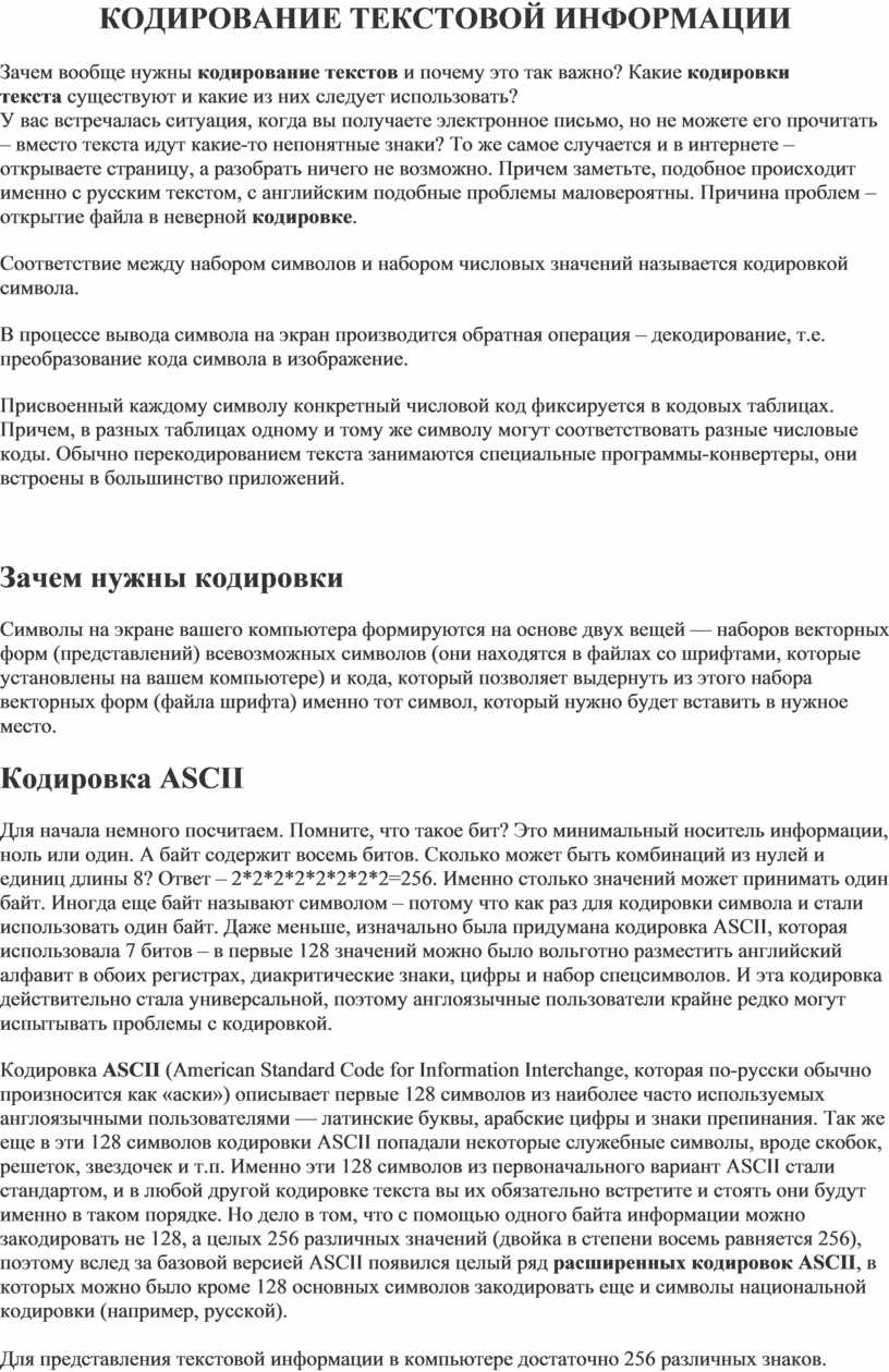 Кодировка ASCII (American Standard Code for Information Interchange, которая по-русски обычно произносится как «аски») описывает первые 128 символов из наиболее часто используемых англоязычными пользователями — латинские буквы, арабские цифры и знаки препинания. Так же еще в эти 128 символов кодировки ASCII попадали некоторые служебные символы, вроде скобок, решеток, звездочек и т.п. Именно эти 128 символов из первоначального вариант ASCII стали стандартом, и в любой другой кодировке текста вы их обязательно встретите и стоять они будут именно в таком порядке. Но дело в том, что с помощью одного байта информации можно закодировать не 128, а целых 256 различных значений (двойка в степени восемь равняется 256), поэтому вслед за базовой версией ASCII появился целый ряд расширенных кодировок ASCII, в которых можно было кроме 128 основных символов закодировать еще и символы национальной кодировки (например, русской).