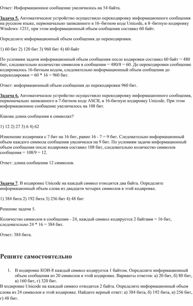 Задача 5. Автоматическое устройство осуществило перекодировку информационного сообщения на русском языке, первоначально записанного в 16–битном коде Unicode, в 8–битную кодировку Windows–1251, при этом информационный объем сообщения составил 60 байт.