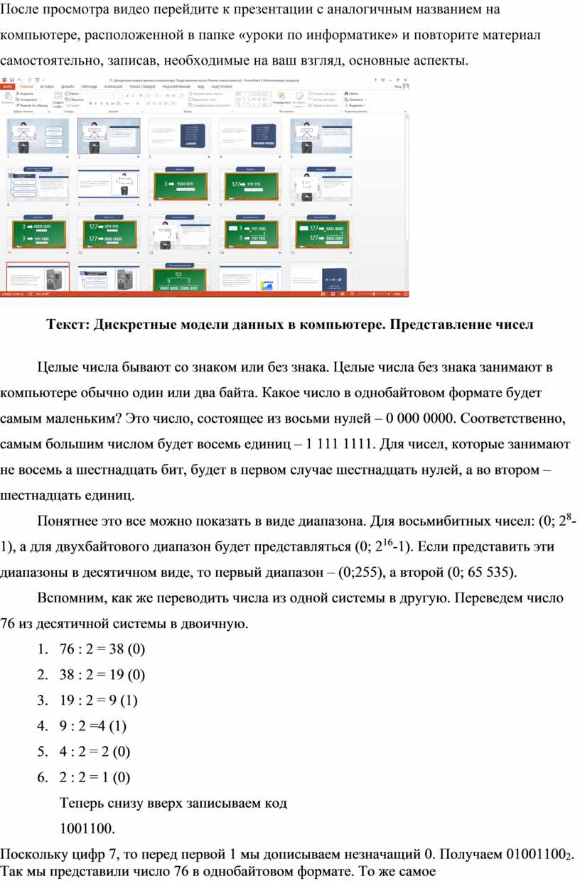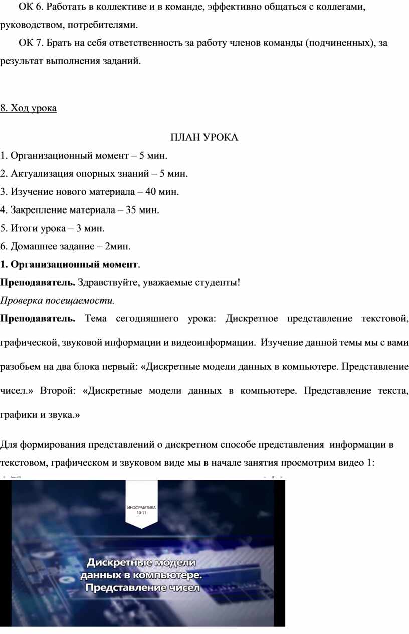 Преподаватель. Тема сегодняшнего урока: Дискретное представление текстовой, графической, звуковой информации и видеоинформации. Изучение данной темы мы с вами разобьем на два блока первый: «Дискретные модели данных в компьютере. Представление чисел.» Второй: «Дискретные модели данных в компьютере. Представление текста, графики и звука.»