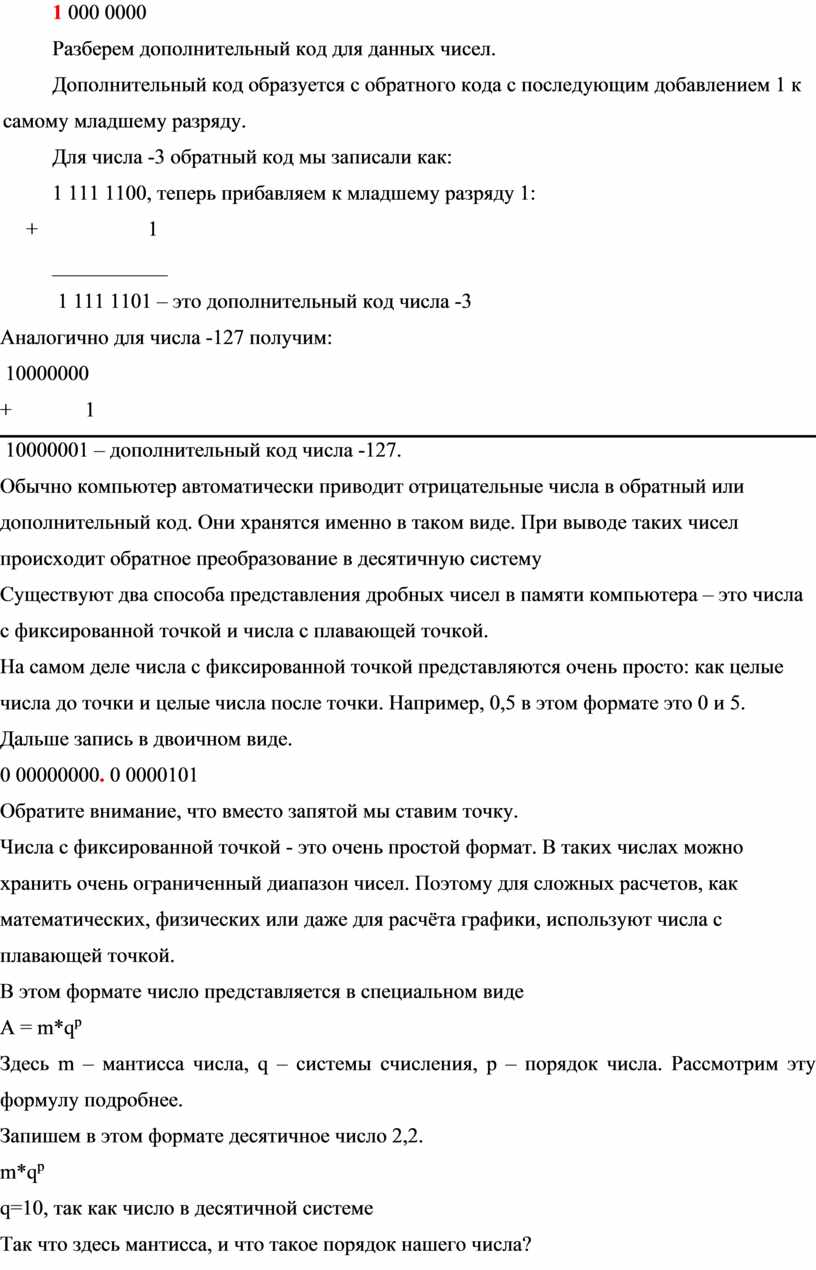 Запишем число -127 в двоичном коде. Проделываем тот же алгоритм. Получаем: 1 111 1111. Опять же на знаковом разряде у нас 1, а дальше двоичный код числа 127.