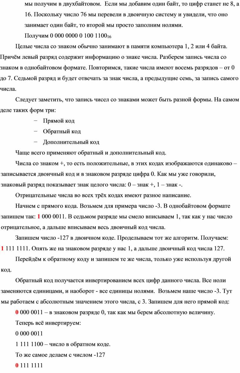 Поскольку цифр 7, то перед первой 1 мы дописываем незначащий 0. Получаем 010011002. Так мы представили число 76 в однобайтовом формате. То же самое мы получим в двухбайтовом. Если мы добавим один байт, то цифр станет не 8, а 16. Поскольку число 76 мы перевели в двоичную систему и увидели, что оно занимает один байт, то второй мы просто заполним нолями.